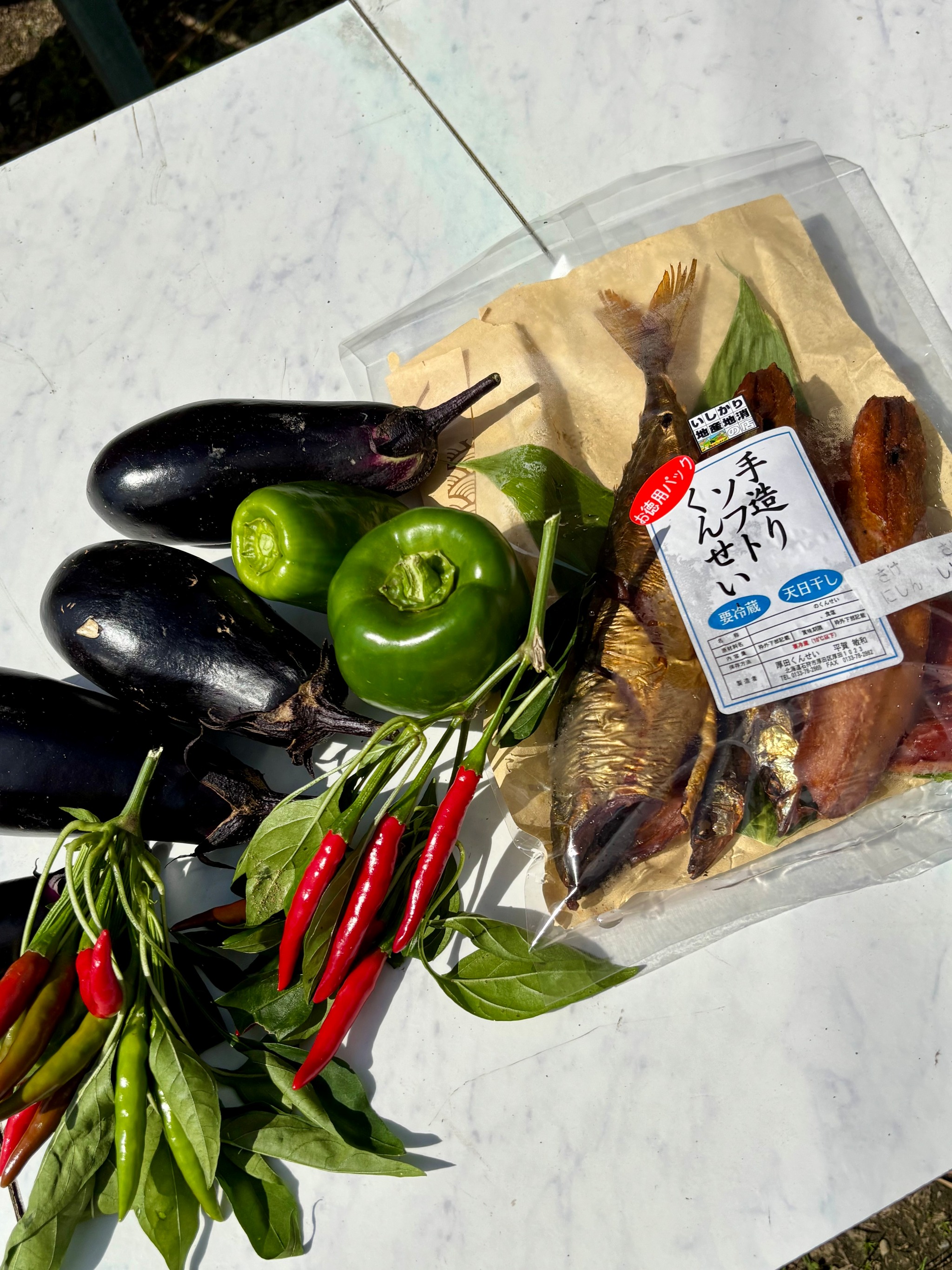 ちょうどお庭にいらしたお婆様が、家庭菜園で採れたナスやピーマン、唐辛子を「これ持っていきなさい」とおまけにくださいました。